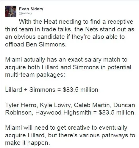 According to NBA Reporter Evan Sidery, the Miami Heat would have the money to pay both of them, Simmons and Lillard have combined salaries of $83.5m, the franchise would have to get rid of Tyler Herro, Kyle Lowry, Caleb Martin, Duncan Robinson and Haywood Highsmith since their salaries are equivalent to $83.5m.