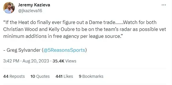 “If the Heat do finally ever figure out a Dame trade…….Watch for both Christian Wood and Kelly Oubre to be on the team’s radar as possible vet minimum additions in free agency per league source.”