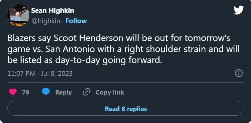 Unfortunately, Scoot Henderson suffered a shoulder injury and will not be available for this game. The worst thing is that he will likely miss the rest of the Summer League. According to Sean Highkin, the Blazers said that Henderson will not only miss the game against the Spurs but will also be listed as day-to-day.