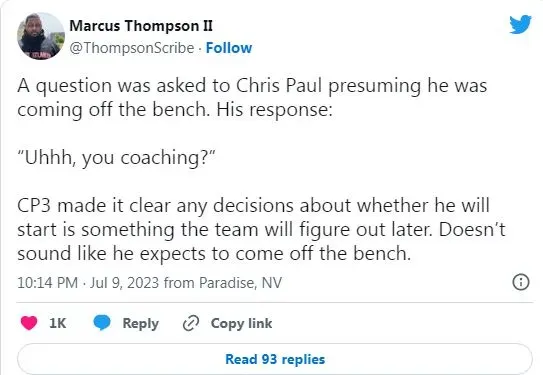 This short and direct response from Chris Paul indicates that he would be willing to play as decided by the Warriors’ coaching staff, whether as a starter or coming off the bench. If he comes off the bench, it would be the first time in his career.