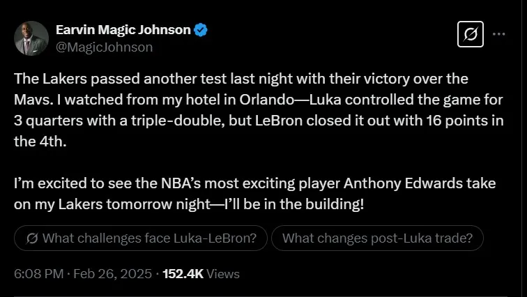 Magic Johnson made his statement via his X (formerly Twitter) account, expressing his admiration for Edwards while hyping up the upcoming Lakers-Timberwolves game: “I’m excited to see the NBA’s most exciting player, Anthony Edwards, take on my Lakers tomorrow night—I’ll be in the building!”