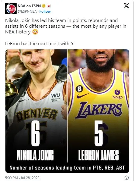 According to ESPN Stats, Nikola Jokic has led the Denver Nuggets in points, rebounds, and assists for six consecutive seasons. LeBron James is the only other player in NBA history to do this, and he did it in five seasons.