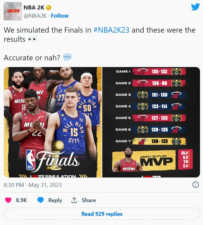 Using simmed games on NBA 2K23, the popular videogame predicted the Miami Heat to win the 2023 NBA Finals against the Denver Nuggets. In addition, Jimmy Butler was predicted to be the Finals MVP.