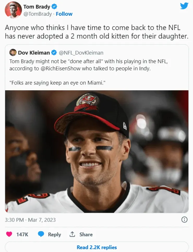 Only a day later, the most successful player in NFL history quoted the tweet with a hilarious reason why he doesn’t have time to come back. “Anyone who thinks I have time to come back to the NFL has never adopted a 2 month old kitten for their daughter,” Brady tweeted.
