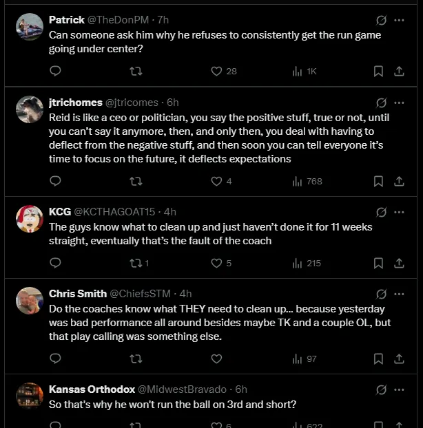 Some fans insist that despite Reid claiming the team needs to improve, no visible progress has been made. “Delusional statements from a HC with tunnel vision. They are all in denial. I love my Chiefs but this team ain’t it! And if they know what you need to clean up which week are they going to clean it up? We are 10 games in and they already had their bye. This is crazy!” commented another fan (@HarrisLyleL).