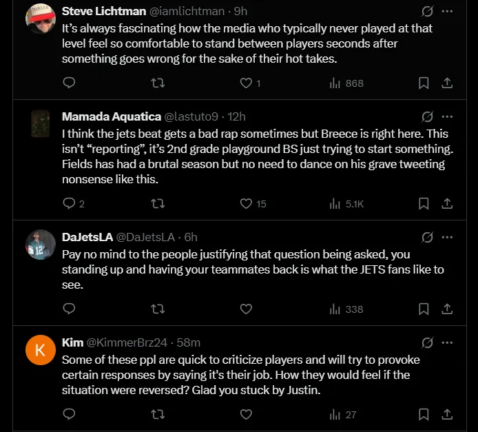 Jets fans reacted positively to Hall’s defense of Fields. “Notice how Justin fields teammates ALWAYS have his back. Non-ball knowers can question his qb ability all they want but his character and leadership ability is top notch,” wrote Hector (@jpajamer) about Hall’s actions and how other teammates have previously supported Fields.