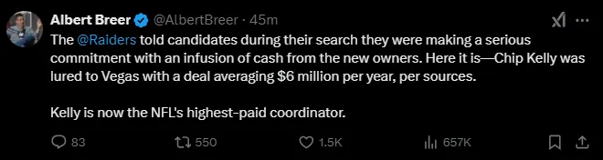Chip Kelly joined the Las Vegas Raiders to help lift the franchise from the bottom, but his return to the NFL didnāt come cheap. The teamās front office went all out financially to convince him to sign on as a coordinator.