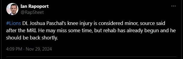 According to Ian Rapoport, Paschal’s knee injury is now considered minor, as confirmed by a source when the MRI results were revealed. While Paschal will miss some time as a starter, it’s still unclear how many games he’ll be sidelined. However, the report suggests he could return sooner than expected.