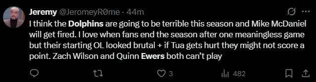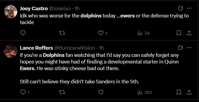Fans were quick to weigh in on X after Ewers’ preseason debut. “Sad to say but, real ball knowers knew this was gonna be the case with Quinn Ewers,” one wrote, while others insisted the rookie simply needs more time to adjust to Miami’s system.
