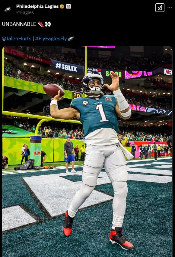 This isn’t the first time Hurts has broken such rules, but what’s more surprising is that the Eagles support this violation. They posted a photo on X of Hurts wearing the ‘illegal’ cleats with the word “UNBANNABLE” in uppercase, knowing it could result in a fine for Hurts after the game.