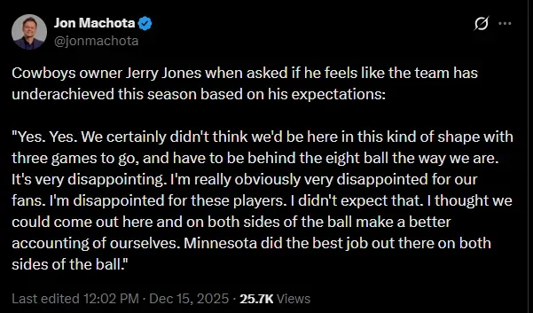 Jonesā frustration went beyond the standings and focused on the sense of urgency that now surrounds the team. He described the Cowboys as being ābehind the eight ball the way we are,ā calling the situation āvery disappointing,ā particularly for a fan base that entered the year expecting a contender.