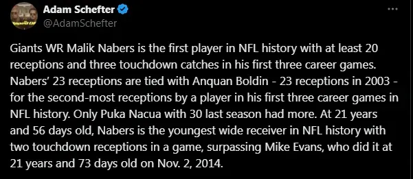 With his performance in Week 3, Nabers became the first player in NFL history to achieve at least 20 receptions and three touchdowns in his first three games, a feat previously matched by Anquan Boldin in 2003. Nabers’ 23 receptions place him among an elite group of players.