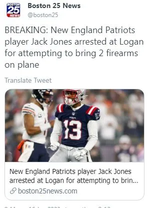 According to the Boston 25 News report, Jack Jones would have been arrested at the airport for an incident related to 2 firearms, he Patriotsβ CB tried to board the plane with both weapons and they were detected during routine check.