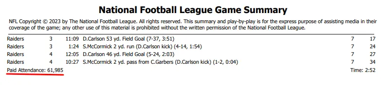 According to the official gamebook published on the Raiders.com website, a total of 61,985 fans attended the Las Vegas Raiders preseason opener against the San Francisco 49ers, in a 34-7 home team victory. Allegiant Stadium has a capacity of 65,000 up to 71,835 seats.