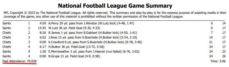 According to the official gamebook, 70,028 fans attended the preseason opener of the New Orleans Saints against the Kansas City Chiefs. The home team won the game 26-24. The Caesars Superdome has a capacity of 73,208 up to 76,468 seats.