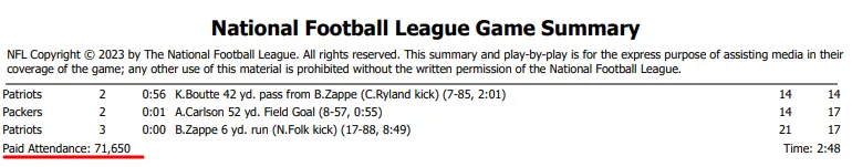 According to the official gamebook published on NFL.com, 71,650 fans attended the Patriots vs. Packers preseason Game 2. Lambeau Field’s capacity is 81,441 seats.