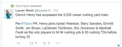 According to NFL stats, Lauren Walsh (@lauwalsh10) and Titansâ PR team, Derrick Henry surpassed 9,000 rushing yards during the Week 12 game against the Carolina Panthers. That personal record gives Henry access to an exclusive list of players under 30 years of age with 9,000 yards and 80 rushing TDs.