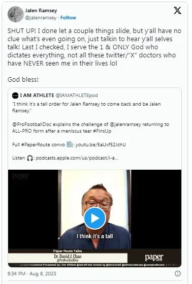 After Dr. David J. Chao (@profootballdoc) spoke to I AM ATHLETE (@IAMATHLETEpod) about Ramseyâs meniscus tear injury recovery time, that prompted a strong response from Jalen Ramsey directly on his Twitter account saying: âSHUT UP! I done let a couple things slide, but yâall have no clue whatâs even going on, just talkin to hear yâall talk! Last I checked, I serve the 1 & ONLY God who dictates everything, not all these twitter/âXâ doctors who have NEVER seen me in their lives lolâ