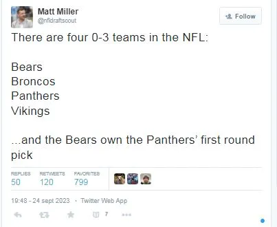 According to stats and ESPNβs Matt Miller, after the Sunday games in Week 3, only four teams are going through an 0-3 streak: the Chicago Bears, Denver Broncos, Carolina Panthers, and Minnesota Vikings.