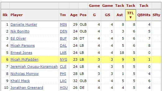 According to Pro Football Reference, the New York Giants LB that ranks 6th overall in tackle for loss is Micah McFadden with 5 tackles, he is only 23 years old and is one of the young talents on defense.