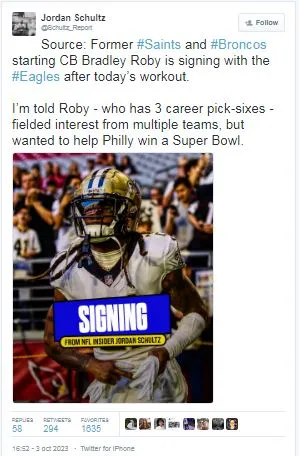 According to Jordan Schultz, the Philadelphia Eagles signed Bradley Roby after a workout today, October 3, he played for the New Orleans Saints and Denver Broncos.