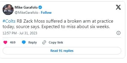 According to a report by Mike Garafolo and sources, the running back who suffered a broken arm was Zack Moss during practice on July 31. He is expected to be back in action within six weeks. Zack Moss is an experienced running back, having played for the Buffalo Bills from 2020 to 2022 before joining the Colts.
