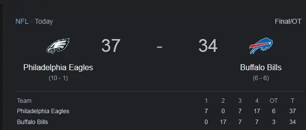 Josh Allen and the Buffalo Bills lost during Week 12 against the Philadelphia Eagles by 37-34 OT on the road in what was the sixth loss of the season for them.
