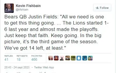 According to testimony collected by Kevin Fishbain, Chicago Bears’ QB Justin Fields said after losing to the Kansas City Chiefs: “All we need is one to get this thing going. … The Lions started 1-6 last year and almost made the playoffs. Just keep that faith. Keep going. In the big picture, it’s the third game of the season. We’ve got 14 left, at least.”