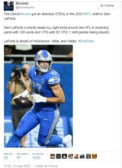 According to stats and BoonerSports, Lions’ TE Sam LaPorta is playing better than other players with much more experience than him. After three weeks into the current season, LaPorta leads all tight ends in receiving yards with 186 and 62 YPG. He is ahead of George Kittle and other big tight ends.