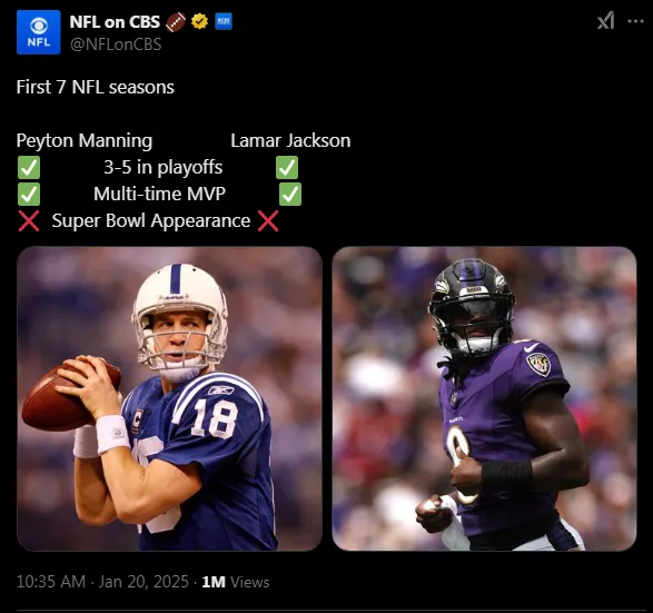 Manning’s first Super Bowl win came in his eighth season in the NFL, playing for the Colts. He had been named the regular-season MVP in 2003 and 2004. Jackson has yet to win two consecutive MVP awards, with the decision for the 2024 season still up in the air.
