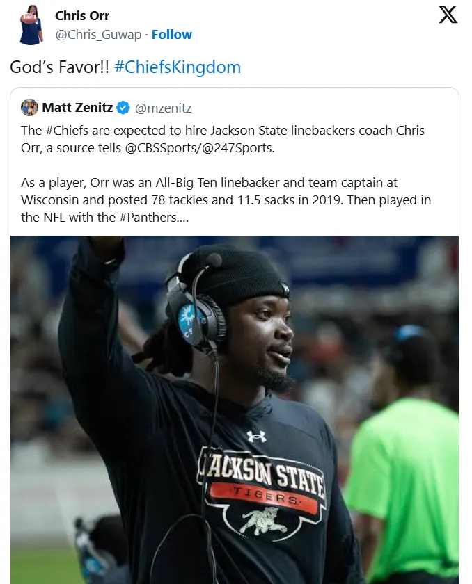 Needless to say, Orr is excited about this opportunity. âGodâs Favor!! #ChiefsKingdom,â he wrote on his X (formerly known as Twitter) account as he prepares to join Reidâs staff to work closely with defensive coordinator Steve Spagnuolo.