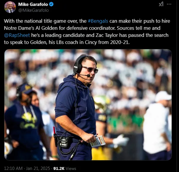 According to Mike Garofolo, the Bengals might make a push to hire Al Golden from Notre Dame for the defensive coordinator position. Sources have indicated that Gordon is the top candidate on their list, and head coach Zac Taylor is reportedly ready to interview him.