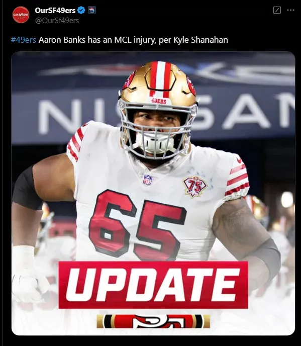 According to recent reports, the 49ersā player ruled out for the remainder of the regular season is Aaron Banks. He sustained an MCL injury during the Week 16 loss to the Dolphins. Banks started in 13 games this season before his injury.