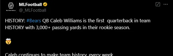 According to the stats, Williams officially became the first Bears quarterback to surpass 3,000 passing yards in his rookie season—an achievement no other rookie quarterback for the team has even come close to dreaming of. Following the Week 16 loss to the Lions, he exceeded the mark by an additional 271 yards.