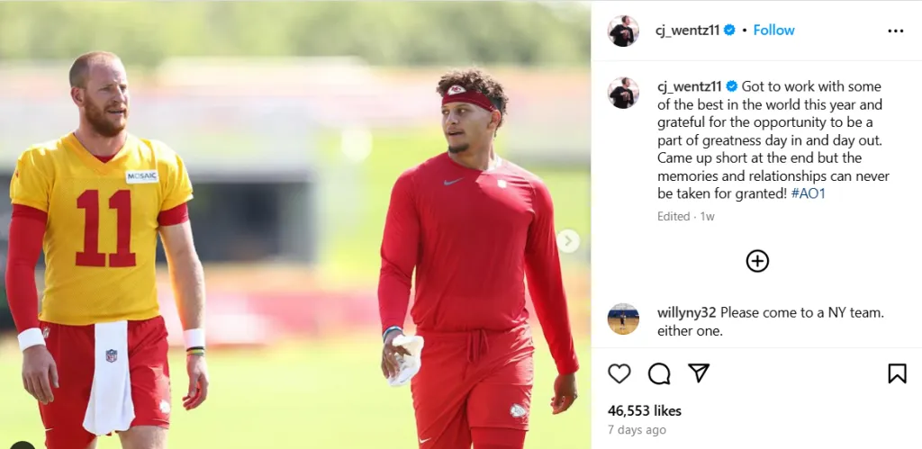 Wentz had already taken to Instagram to share a message of gratitude for the last year with the Chiefs. Shortly after the Super Bowl LIX to his former team, the Philadelphia Eagles, the North Dakota State product made a post where he appeared to be particularly grateful for the experience of having Mahomes and Kelce as teammates.