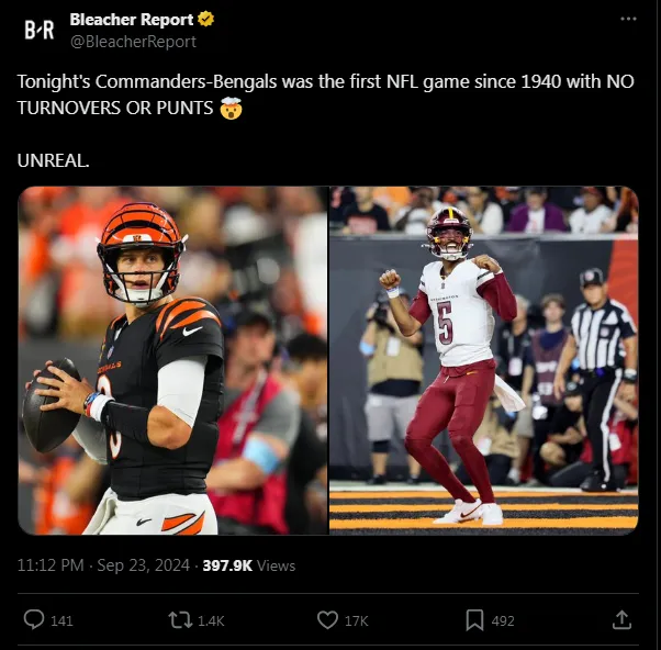 The final game of Week 3 in the 2024 NFL season was noteworthy not only for Jayden Danielsā performance with the Washington Commanders against the Cincinnati Bengals, but also for breaking a record that hadnāt been surpassed since 1940āthanks to the efforts of both teams.