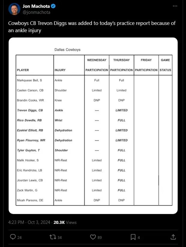 Cornerback Trevon Diggs has landed on the injury report as of Thursday, October 3, with an ankle injury. This raises concerns, as Diggs has been a consistent presence, playing in all four games of the 2024 NFL season.