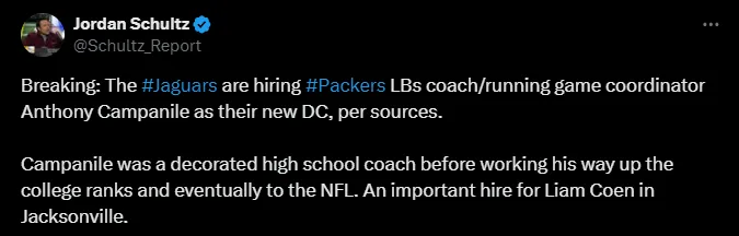 According to Jordan Schultz, the Jaguars have hired Anthony Campanile as their new defensive coordinator, filling the position left by Ryan Nielsen, who spent just one season in Jacksonville after coming over from Atlanta.