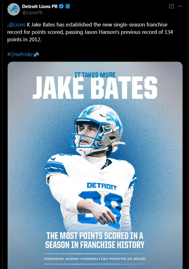 According to Lions’ stats, the previous franchise record for most points in a single season was set by Jason Hanson in 2012 with 134 points. Jake Bates has now surpassed that milestone with 135 points, edging Hanson by just one point. Bates achieved the record thanks to two field goals and two extra points in the Lions’ 40-34 victory over the 49ers.