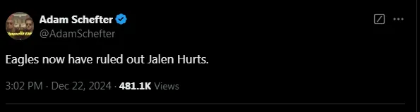 At the time of his exit, Jalen Hurts had attempted just five passes, completing only one for a total of 11 passing yards. His brief appearance came against a relentless Commanders defense still fighting for a postseason spot.