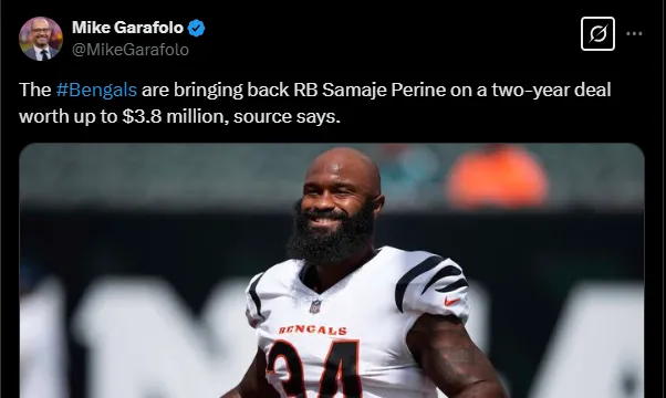 According to Mike Garofolo, the Bengals are giving Samaje Perine another shot, reuniting him with the team for the upcoming season to bolster Burrow’s offensive options. Perine previously played for Cincinnati from 2019 to 2021.