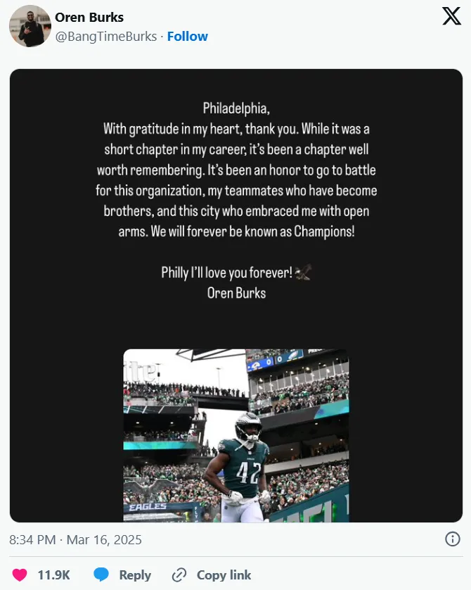 Before joining Burrowās team on Monday, Burks made sure to say goodbye to Hurts and everyone on the Eagles with a heartfelt letter posted on social media: āItās been an honor to go to battle for this organization, my teammates who have become brothers, and this city who embraced me with open arms.ā