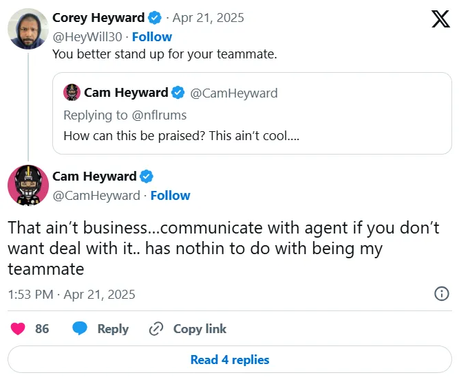 This reaction sparked a curious reply from Heyward’s brother Corey, who connected Cam’s response to the rumors linking Rodgers with the Steelers: “You better stand up for your teammate.”