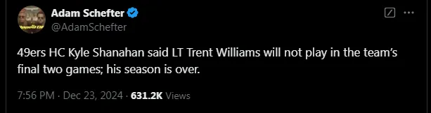 According to Kyle Shanahan, offensive lineman Trent Williams will be unavailable for the final two games of the 2024 regular season. Williams will not return for matchups against the Detroit Lions and Arizona Cardinals. This marks one of two significant losses to the 49ers’ offense heading into the season’s conclusion.
