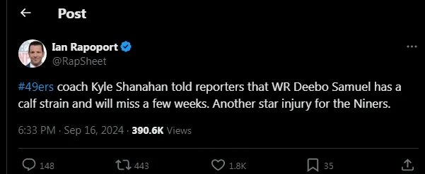 The player in question is Deebo Samuel, who has been a starter in the early games of the 2024 NFL season. While he has yet to score a touchdown, his receiving yards have been on the rise. Against the Vikings, he posted 110 receiving yards, double his total from Week 1 against the Jets at home.
