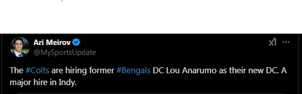 According to information revealed by Ari Meirov, Anarumo will continue his professional career with the Indianapolis Colts, meaning he will move to the AFC South, where the Texans, Jaguars, and Titans play. He will have to adjust his strategies, as he wonāt have the same weapons he had with the Bengals.