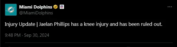According to multiple sources, including the Dolphinsâ official account on X, the injured player is Jaelan Phillips, who reportedly hurt his knee during the game. However, the exact nature of the injury has yet to be confirmed.