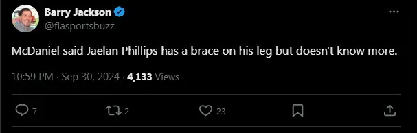 After the game, McDaniel said that Phillips was wearing a brace on his leg but didnât have further details on the injury. Itâs worth noting that Phillips had recently recovered from an Achilles injury he sustained in November 2023.