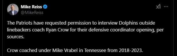 Mike Vrabel and the New England Patriots are making internal changes to improve the team heading into the 2025 season, and it was recently revealed that they requested an interview with the Miami Dolphins outside linebackers coach for the defensive coordinator position.
