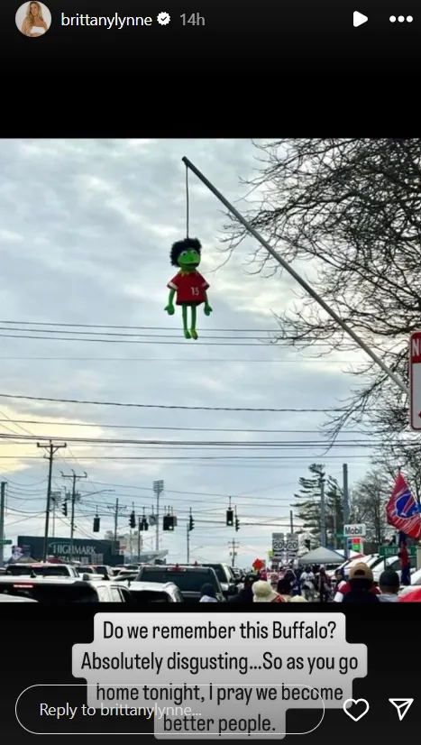 “Do we remember this, Buffalo? Absolutely disgusting,” Brittany Mahomes wrote in her Instagram story, along with a photo of the incident. “So as you go home tonight, I pray we become better people.”